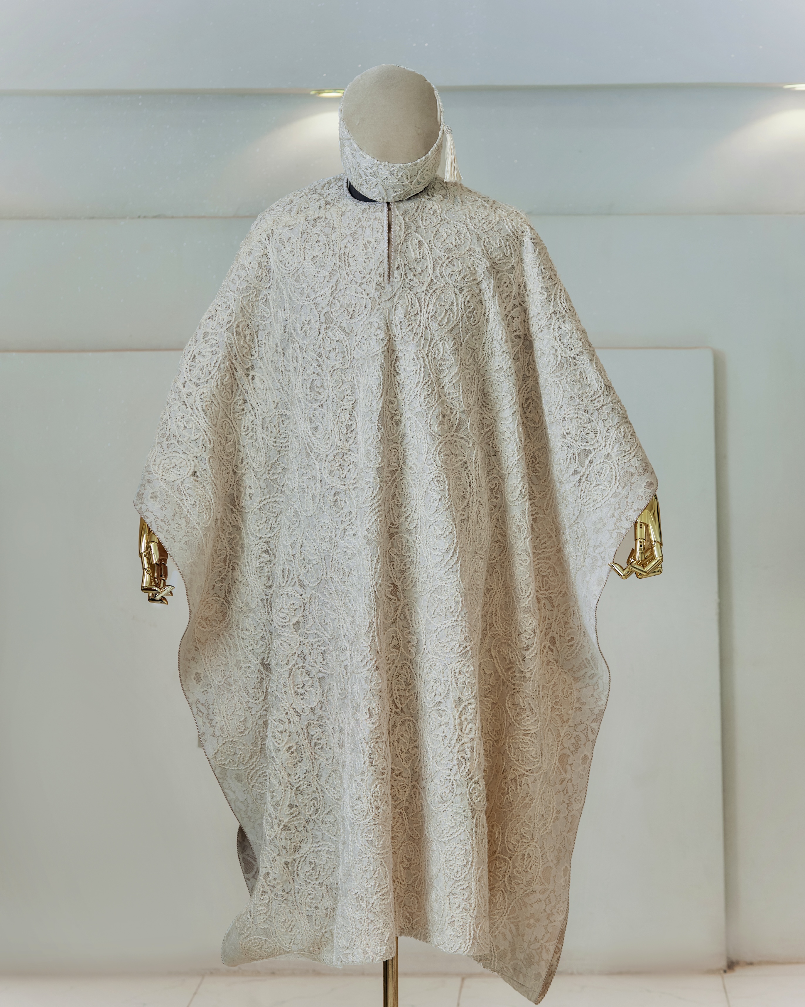 This design channels the timeless elegance of ceremonial garb while introducing modern silhouettes and regal accents. Inspired by cultural richness and gentle opulence, it celebrates a harmony between past and present.