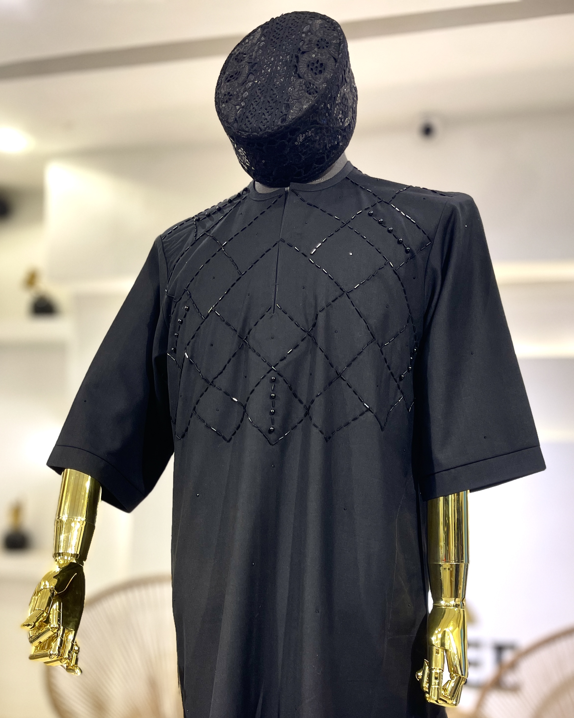 Accessories: The mannequin is styled with a black, textured cap featuring similar embellishments, which ties the look together seamlessly and adds a regal, cultural flair.