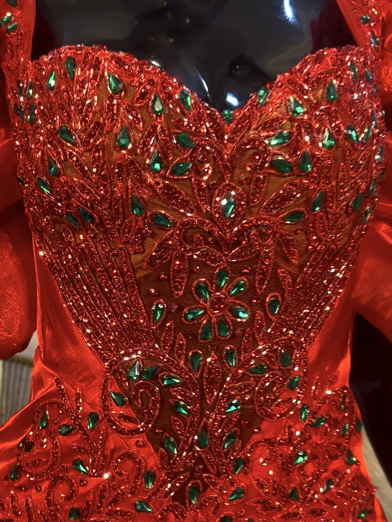 -Texture: This dress is heavily embellished with red and green crystal beading, arranged in ornate,