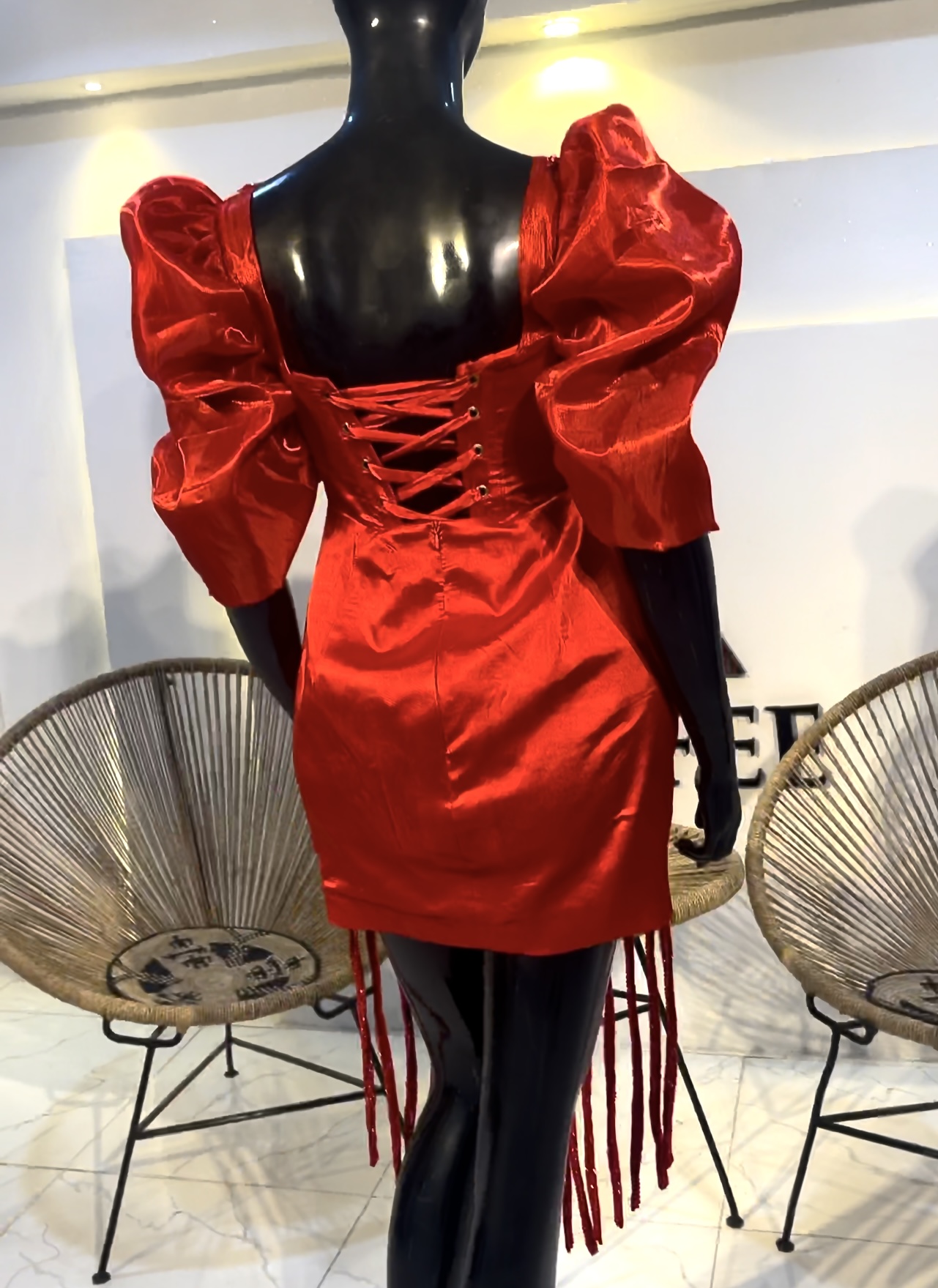 The mix of classic opulence (puff sleeves, rich red satin) and modern drama (short length, fringe, sparkle) makes it unforgettable.