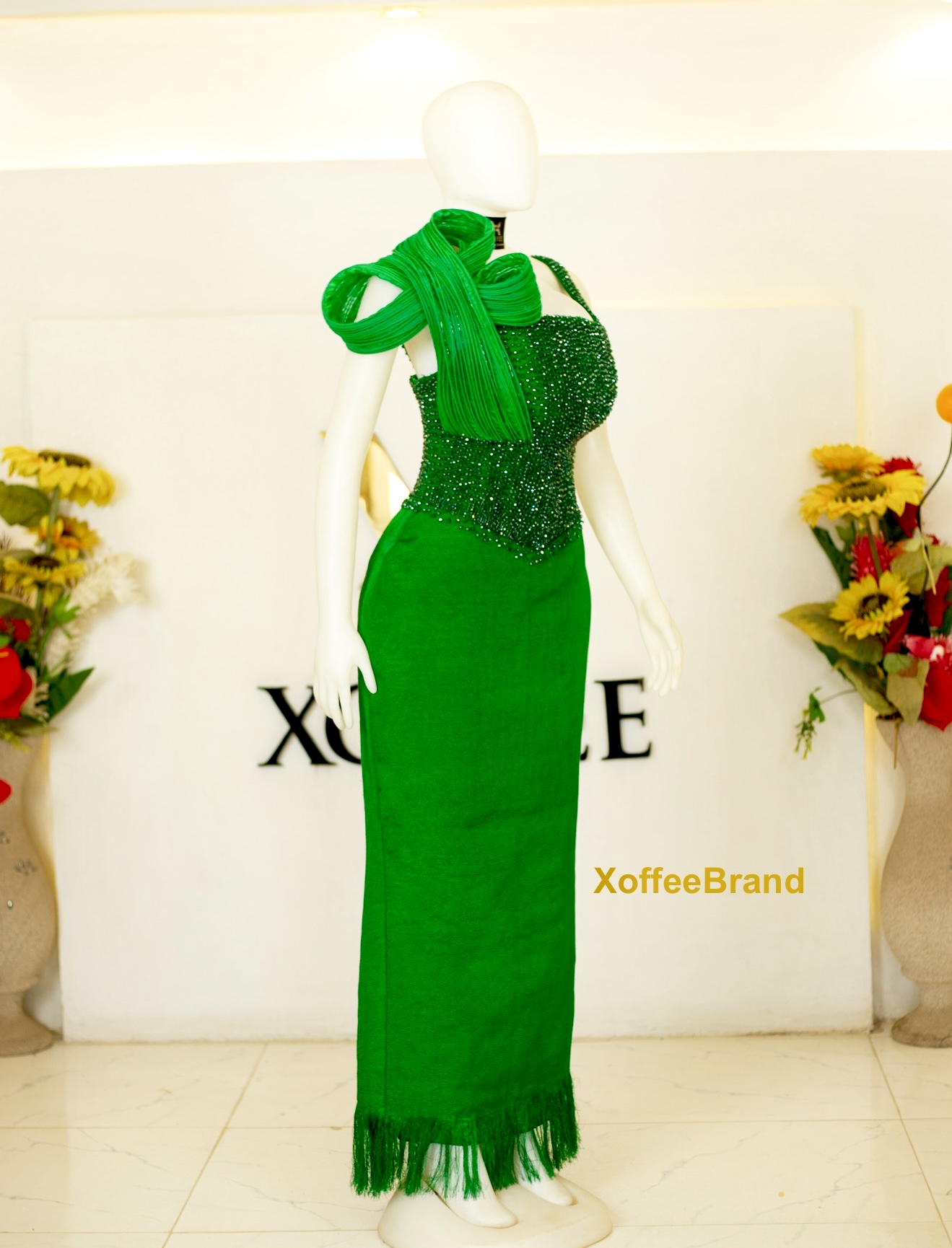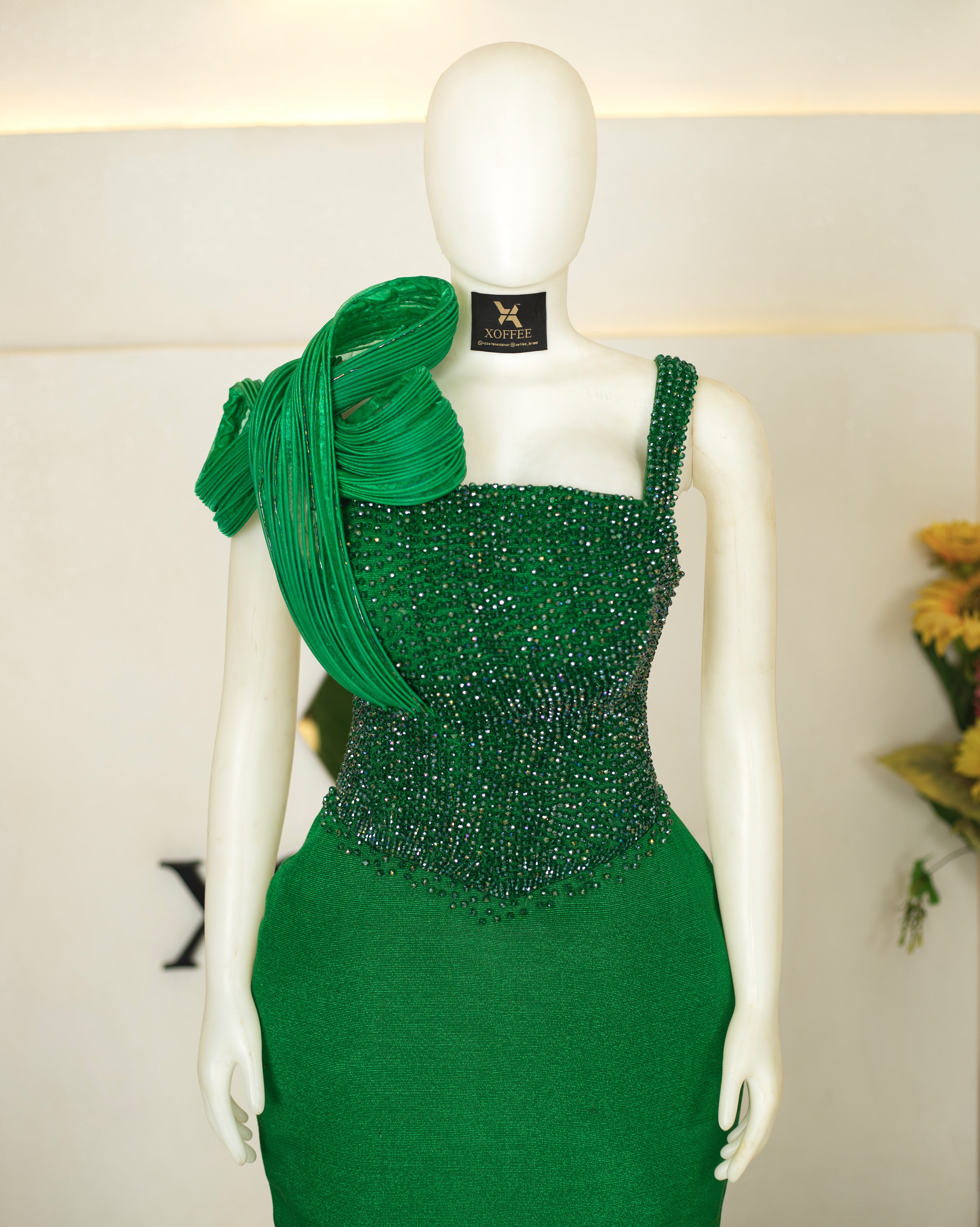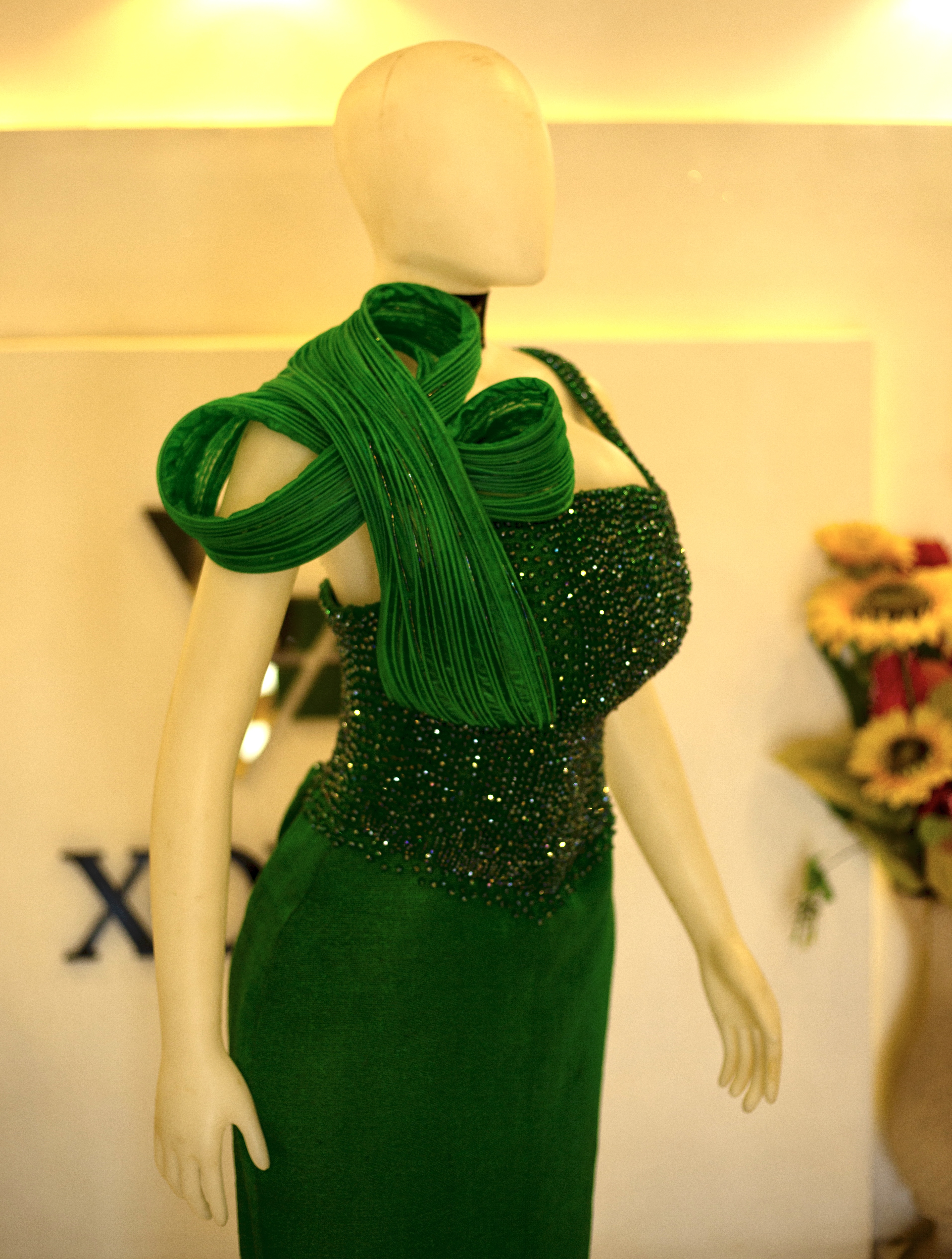 Bodice: The bodice is heavily adorned with green beading, creating a sparkling, textured effect. It is fitted and structured, emphasizing the waistline.