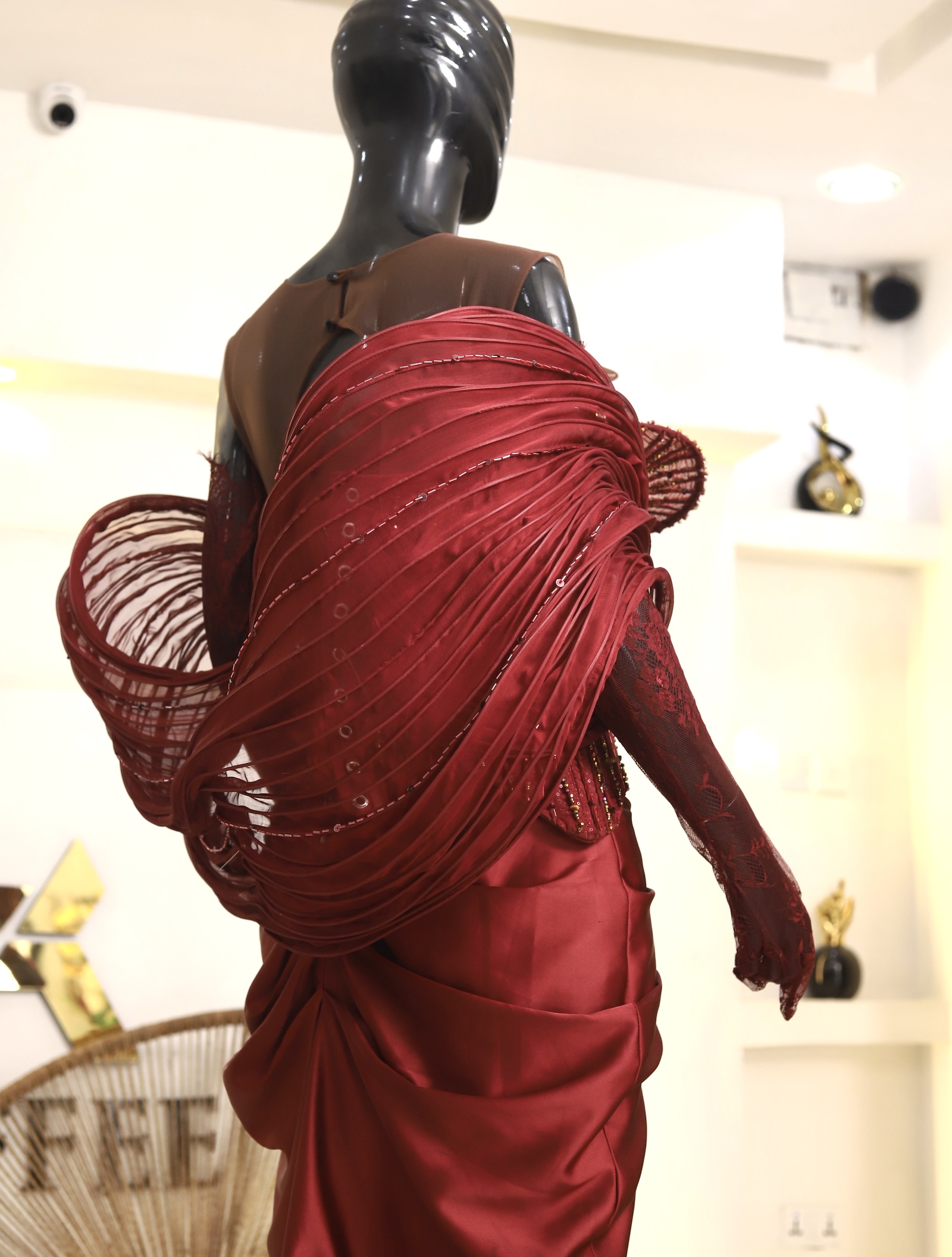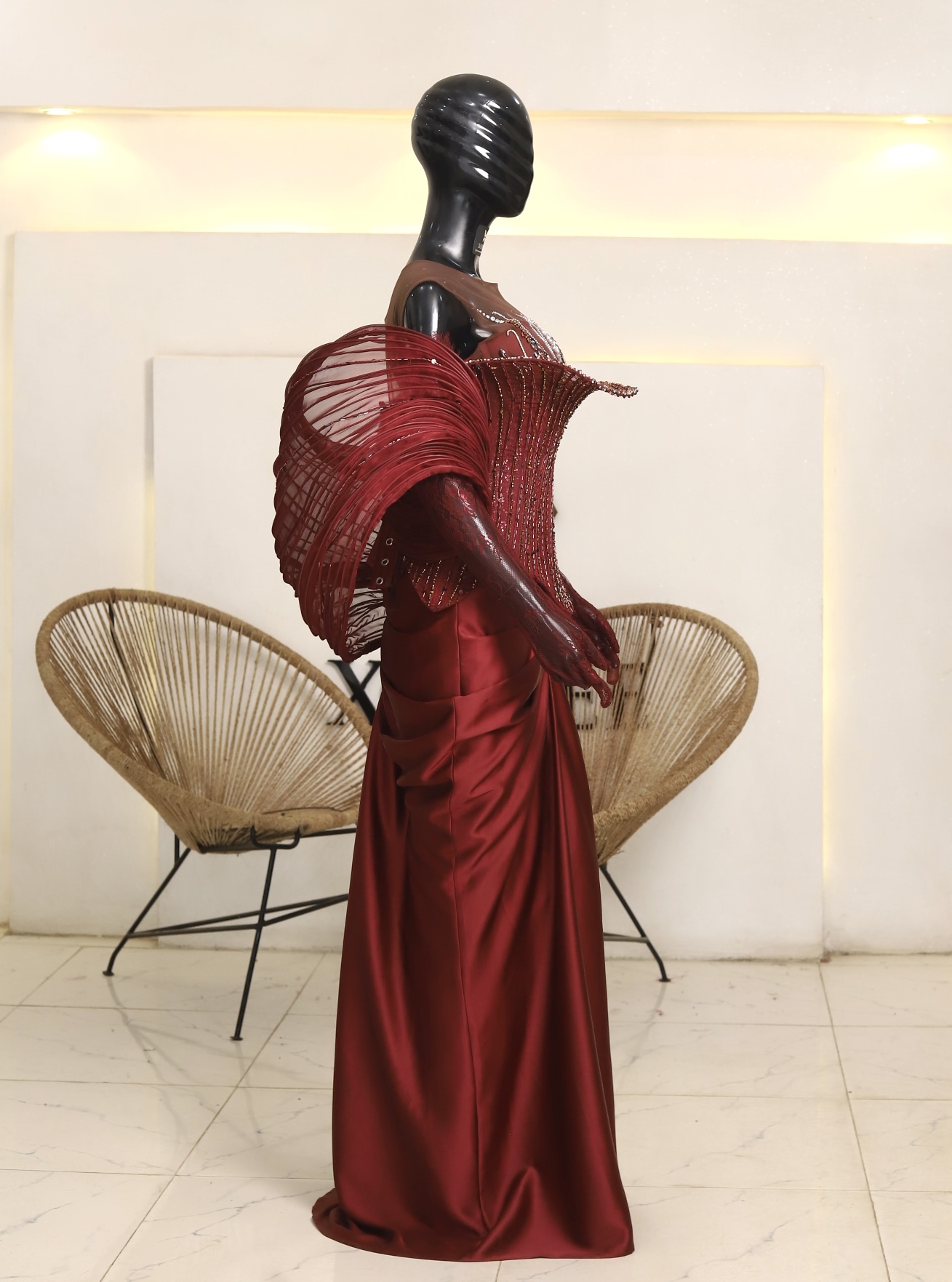 Fabric and Color: The gown is made from a rich, deep burgundy satin fabric, giving it a smooth, lustrous appearance.
